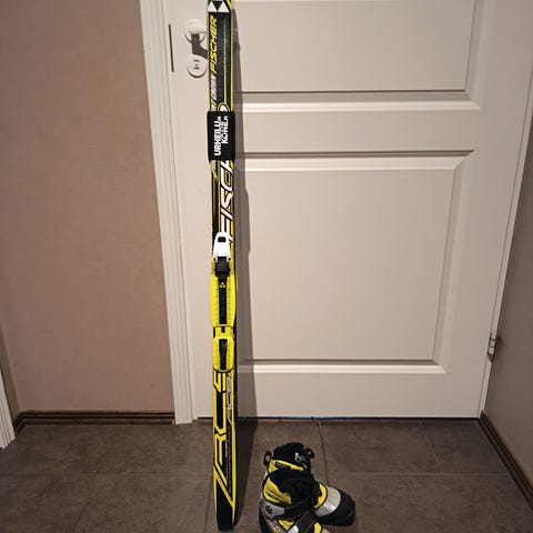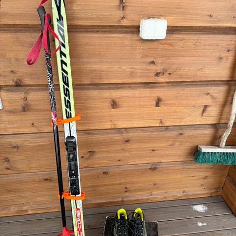 Hyväkuntoinen suksisetti. Sukset 130cm ja sauvat 95cm.