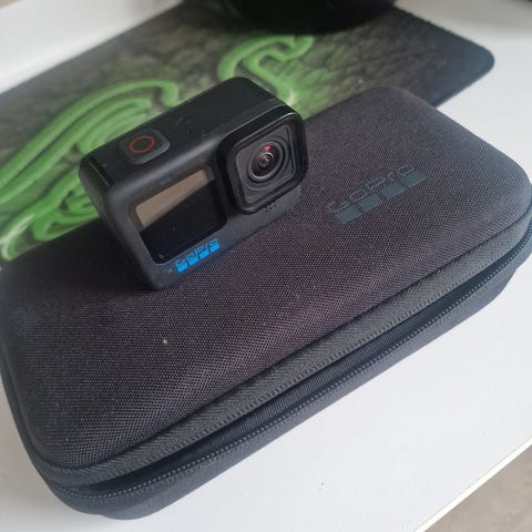 GoPro 11 kamera. Mukana kuvissa näkyvät lisävarusteet, kuten suojakotelo hihnalla, media mod, kaksi akkua, kiinnitysosia sekä polarpron nd-filtteri paketti (8, 16 ja 32nd)