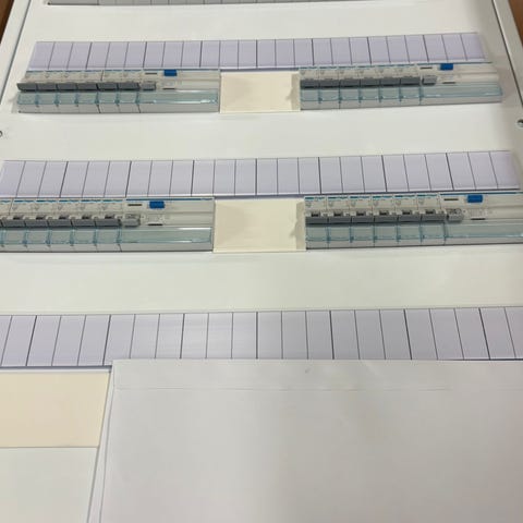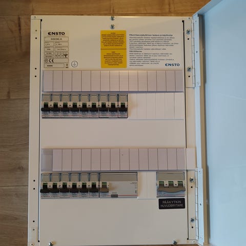 Pinta-asennettava ryhmäkeskus kahdella vikavirtasuojalla, 12 kpl 10A johdinsuojaa ja 12 kpl 16A johdinsuojaa.