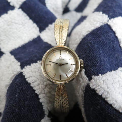 Omega miesten kultainen rannekello, jossa vaalea pyöreä kellotaulu ja kultasävyinen kuori. Kellossa on ruskea kuvioitu nahkaranneke perinteisellä solkikiinnityksellä. Analoginen näyttö tunti-, minuutti- ja sekuntiosoittimilla. Sopii miehille arki- ja juhlakäyttöön.
