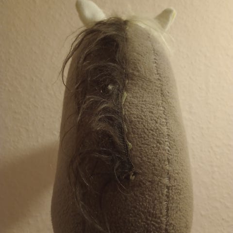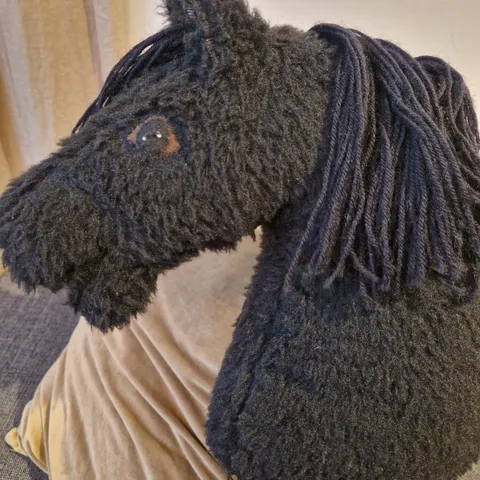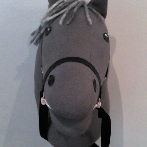 Ruskea keppihevonen pehmeää fleeseä. Suitsista soljet saa auki ja ohjat irroitettua metallikuolaimista. Pituus 77cm.