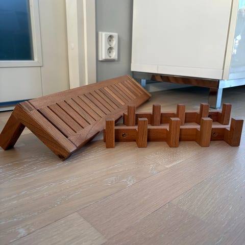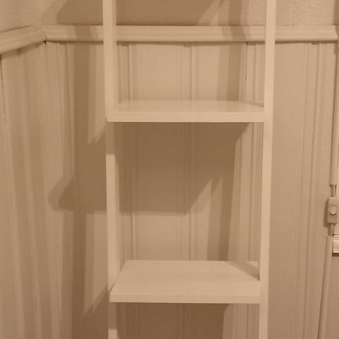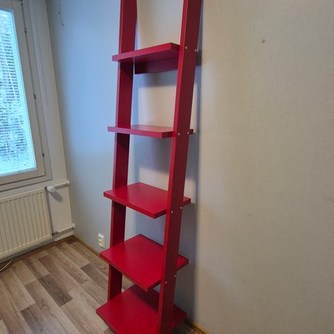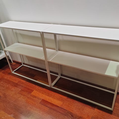 Valkoinen matala tikashylly. Kolme hyllyä.