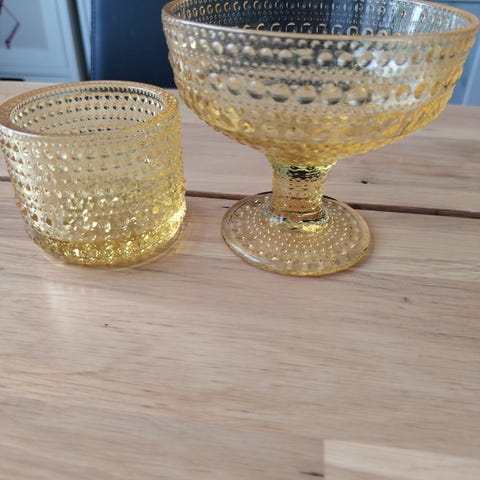 Iittala Kastehelmi tuikkukupit. Materiaalina värillinen lasi, väreinä turkoosi ja keltainen.