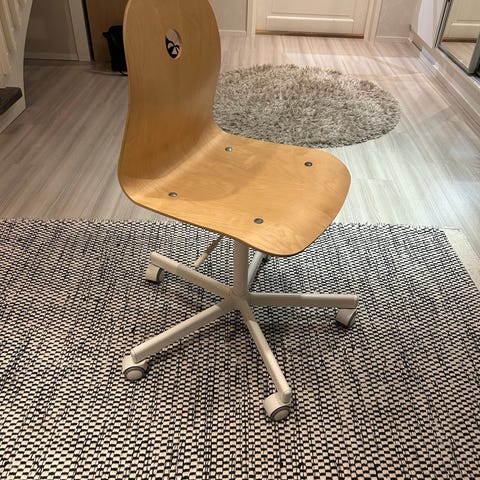 Ikeasta ostettu musta "Muumipappa" työtuoli. Kääntyvä ja nosto/lasku mekanismilla varustettu eli korkeus säädettävissä itselle juuri sopivaksi.