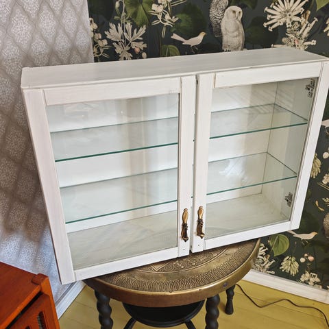 Seinäkaappi / seinävitriini mäntyä. Ikkunat aito lasia. Maalattu kalkkimaalilla. Katso mitat kuvasta.