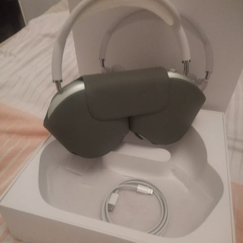 Apple AirPods Max kuulokkeet, väri vihreä. Mukana kuvissa näkyvä suojakotelo.