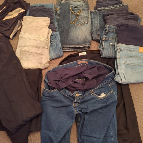 Äitiysvaatteita; kahdet farkut, kevyt toppahousut, leggingsit, joustavat housut, 2 mustaa mekkoa(puuvilla) t-paidat 3kpl,pitkähihaisia paitoja 2kpl,mustat äitiyssukkahousut. Kaikki pestyjä vaatteita. Hyväkuntoisia, osaa vain vähän käytetty osaa enemmän. Kaikki mustia,paitsi farkut ovat tumman ja vaalean siniset, tunika tumman sininen. Koko pääasiassa M-38. Kiinnostuneelle laitan kuvia. Mielellään paketissa myyn.