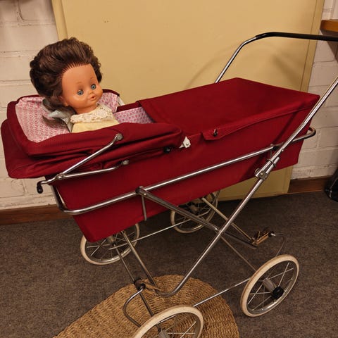 Myydään nukkefiguuri, eläinhahmot sekä kuljetusvaunu.