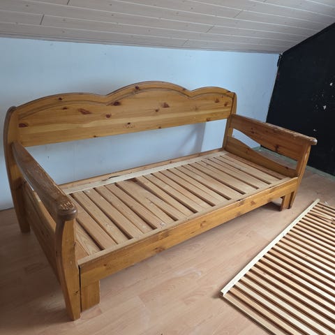 Annetaan musta vuodesohva. Materiaali nahan kaltainen. Kangas revennyt istuinosassa. Avattuna 174x106 cm. Vain nouto.