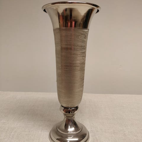 Upea alumiinimalja, uusi, vain paketista purettu. Korkeus 33 cm, yläosan halkaisija 13 cm. Näitä löytyy yhteensä 4 kpl, hinta/kpl.