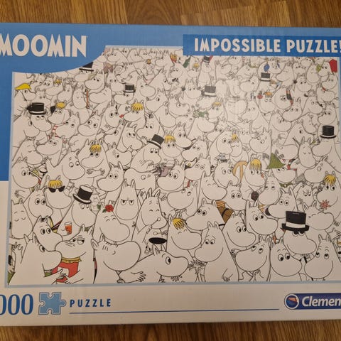 Moomin 1000 palan palapeli, jossa kuvassa Muumi-hahmoja kukkakedolla. Palapeli on koottu ja liimattu sekä laitettu valkoiseen kehykseen. Sopii esimerkiksi seinäkoristeeksi. Koko 50x70. Ikean fiskbo kehykset.