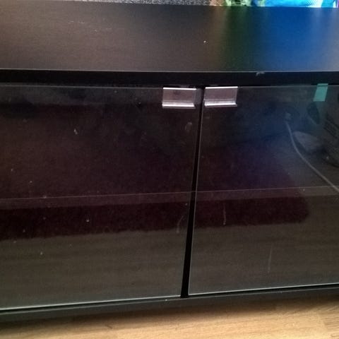 Jykevä musta tv taso. Jotain lastulevyä, joka pinnoitettu näyttämään hiilikuidulta. Vankka metallinen runko. Auringonvaloa vasten näkyy kulumaa, mutta muuten hyväkuntoinen.