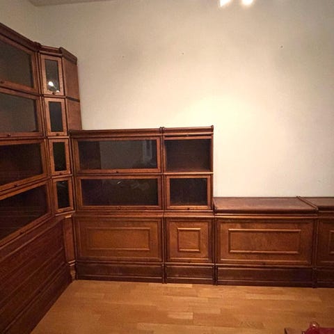 Kaksi tummanruskeat hyväkuntoista umpiovista mappivitriiniä ja lasiovisesta mappivitriiniiä + 3-osainen nurkkavitriini (korkea+matala),alasokkelit ja yläsokkelit. Toisessa mappivitriinissä on pieni naarmu,katso kuvat.