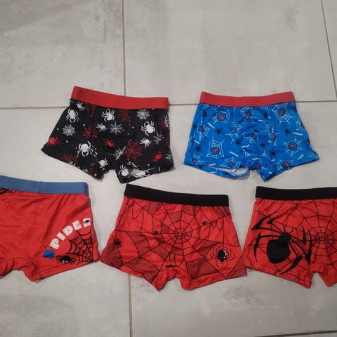 Vähän käytetty spiderman bokserit. Käytetty 110-116 koossa. Joissakin repsottaa narua mutta silti ehjät eli voi käyttää. 11 kappaletta.