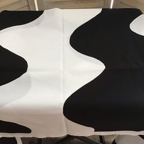 Marimekko Lokki kangas. Pituus 217, leveys 132. Toisessa päässä leveä käänne, toisessa muutaman sentin.