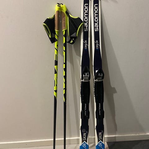 Madshus Active -karvapohjasukset ja Rottefella-siteet. Mukaan saa kuvissa näkyvät sauvat 105cm, toisesta puuttuu remmi. Kouluhiihdossa käytetty.