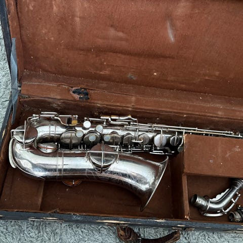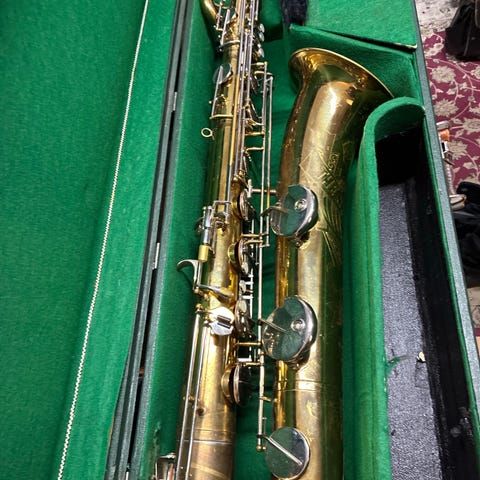 Selmer baritonisaksofoni, pitkä malli( ala A). Valmistusvuosi 1958, sarjano.77xxx