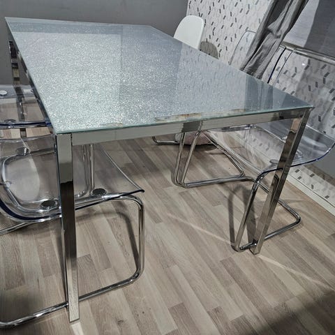 4 hengen pöytä korkeakiiltokannella ja krominvärisellä kehikolla. Ollut vain vähällä käytöllä.