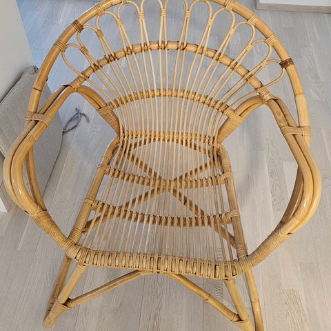 Rottinkinen ruokapöydän tuoli valkoisella istuinpäälisellä. Päällisessä pientä tahraa, en ole yrittänyt pestä. Saa irti sa pestyä😊