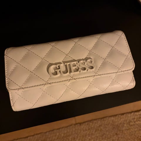 Guess lompakko naisille, valmistettu mustasta tekonahasta. Lompakossa on kohokuvioitu pinta ja edessä metallinen Guess-koriste. Sisäpuolella useita korttipaikkoja, läpinäkyvät paikat esimerkiksi henkilökortille sekä vetoketjullinen osio kolikoille. Sopii käteisen, korttien ja pienten arkitavaroiden säilytykseen. Koko 19,5x10