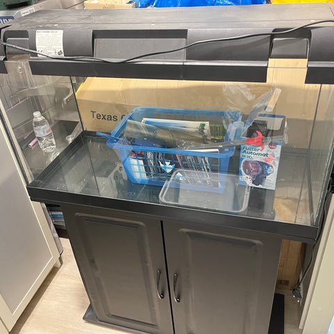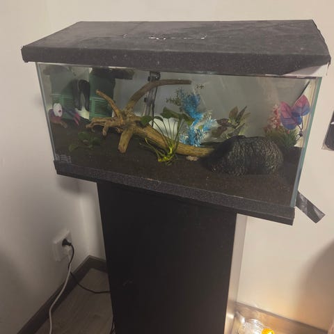Kaareva etulasinen akvaario, jossa on valkoinen alakaappi, itse tehdyt plexit päällä.