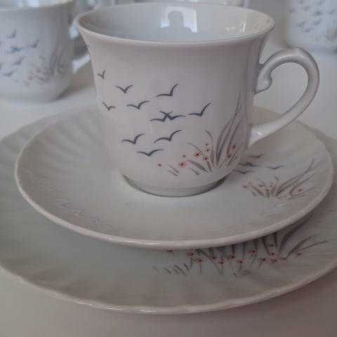 8 kpl isoja ja pieniä lautasia sekä kuppeja. Sokerikko, kermakko ja kannu. 4 ylimääräistä isompaa lautasta ja pienempää. Isoissa lautasissa kahdessa pieni jälki reunassa.