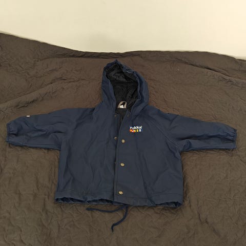 Hyväkuntoinen vuorellinen sadetakki. Käytetty kerran. Koko 86/92cm