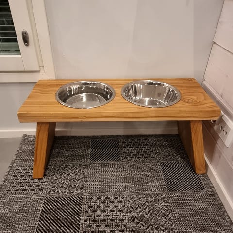 Umpipuinen palikka, voi käyttää esim. pienen eläimen ruokakupin alustana tai korokkeena. Materiaalina näissä mänty, koko n. 17x17cm, korkeus karvan alle 8cm. Maksimi ruokakupin pohjan halkaisija n. 16cm. Reunukset pitää kupin kyydissä. Tassukuvio poltettu puuhun.
