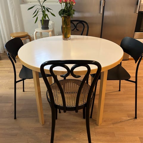 Myynnissä myös kuvassa näkyvät kolme Artek 66 tuolia (150€/kpl). Pientä käytön jälkeä ja pieni pala lohjennut yhden tuolin selkänojasta.