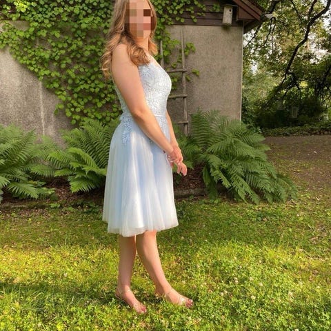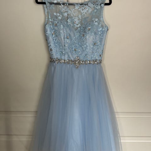 Kerran päällä ollut hyvässä kunnossa oleva sininen rippimekko, jossa taskut sekä nyöri selkä. Koko XS.