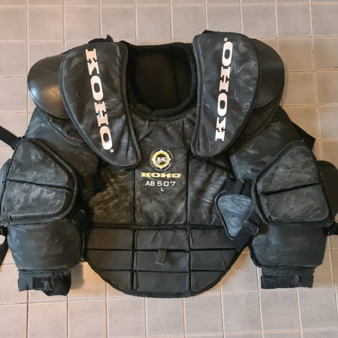 Hyväkuntoinen ja pesty Koho Revolution maalivahdin rintapanssari. Koko sr. Large. Kaikki suojat ja remmit kunnossa.