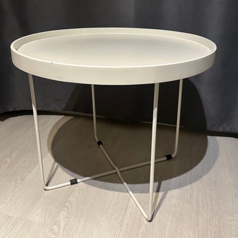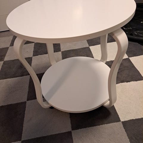 Pyöreä sivupöytä uuteen kotiin tilanpuutteen vuoksi. Pöydässä on kaksi tasoa, joista alempi sopii esimerkiksi lehtien tai pienten esineiden säilytykseen. Soveltuu käytettäväksi olohuoneessa, makuuhuoneessa tai eteisessä pienenä laskutasona.