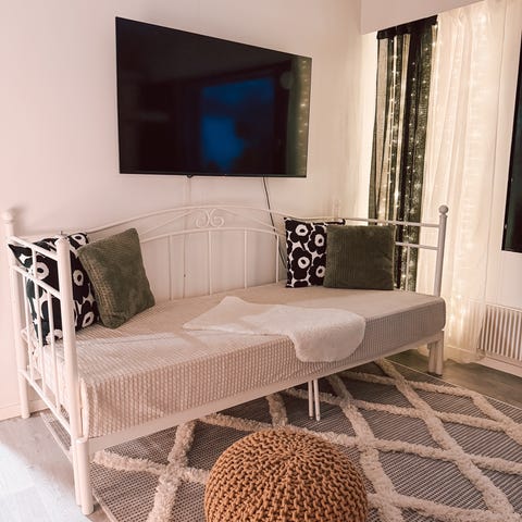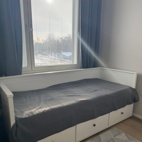 Harmaa kangasverhoiltu sohvasänky. Selkänojat ovat säädettävät ja ne voi laskea alas, jolloin sohva muuttuu makuupaikaksi. Istuinosassa ja selkänojissa on neliötikkaukset ja napit. Sohvasängyssä on metallijalat. Sopii esimerkiksi olohuoneeseen tai vierasvuoteeksi.