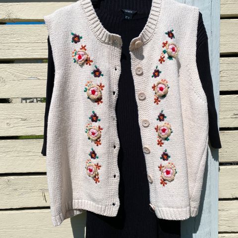 Naisten neuleliivi, koko L. Väri valkoinen tai vaalean beige. Liivissä on V-pääntie ja nappikiinnitys edessä. Neuleessa on läpikuultava, pitsimäinen kuvioneulos kauttaaltaan. Sopii käytettäväksi esimerkiksi puseron tai paidan päällä kerrospukeutumisessa.