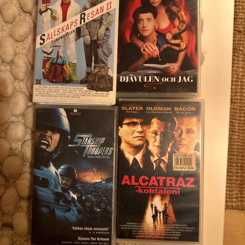 Myydään kuvassa näkyvät VHS-kasetit. Sopii VHS-soittimella katsottavaksi ja kokoelmaa täydentämään. 5e/kpl tai jos ostat kaikki, tarjoa.