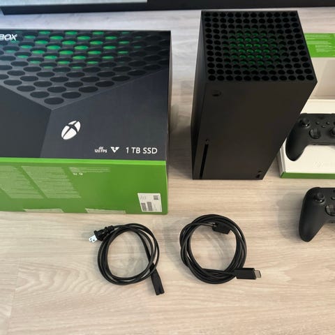 Microsoft Xbox Series X pelikonsoli musta. Konsolissa on levyasema, useita USB-liitäntöjä, HDMI-ulostulo sekä verkkoliitäntä. Mukana virtalähde ja HDMI-piuha.