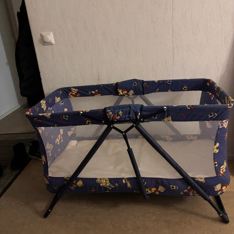 Annetaan matkasänky. Ehjä ja toimiva (yhtä reunaa en saanut kiinni mutta tässä tapauksessa vika on käyttäjässä, ei tuotteessa...😅) Säilytyspussi on, mutta revennyt saumasta.
