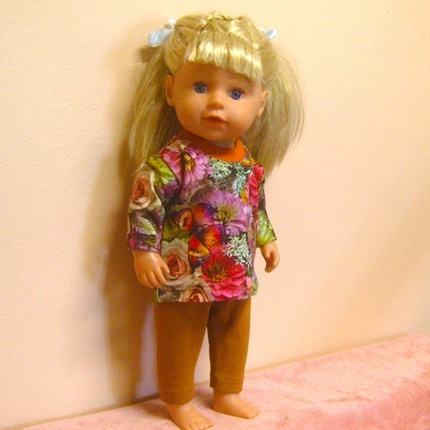 43 cm nukelle (baby born tai sister) trikoosta kuviollinen paita, jossa takana pukemista helpottava tarrakiinnitys. Housut samettitrikoota, vyötäröllä kuminauha.
