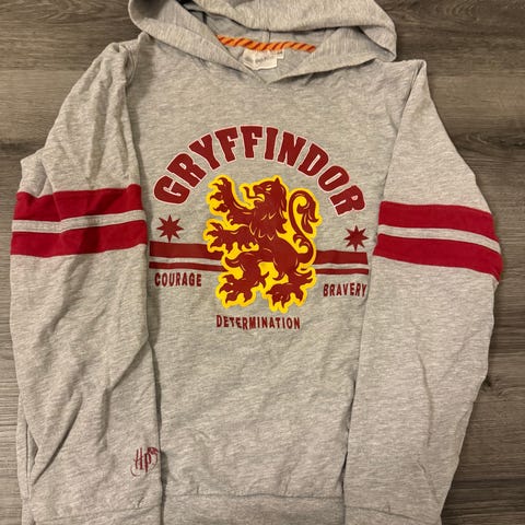 Harry Potter -teemainen "Wizarding World" malliston pitkähihainen Gryffindor-paita lapsille. Koko 152 cm, unisex-malli. Harmaa puuvillapaita, jossa edessä suuri Gryffindor-leijona ja tekstit. Pyöreä pääntie, pitkät hihat ja suora helma. Pituus 47 cm, Rinta 40 cm, Hihat 52 cm, Hartiat 37 cm.