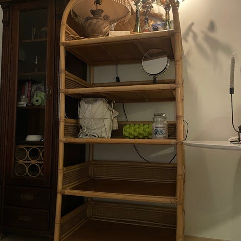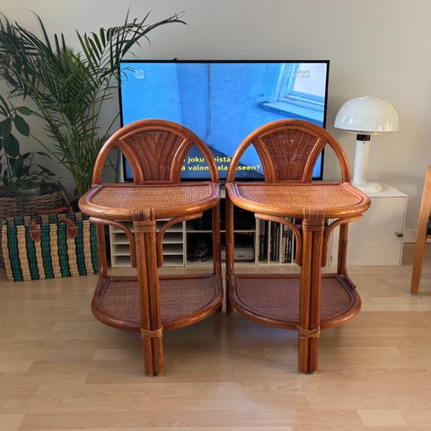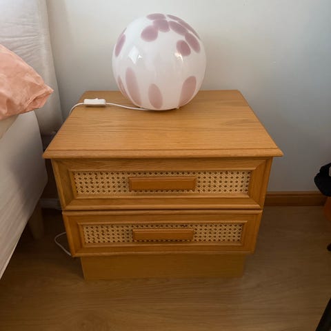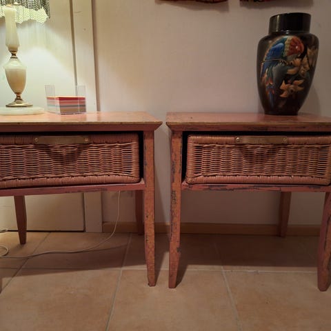 Siistit, retrot yöpöydät, vaaleaa puuta, rottinkia etupaneelissa.