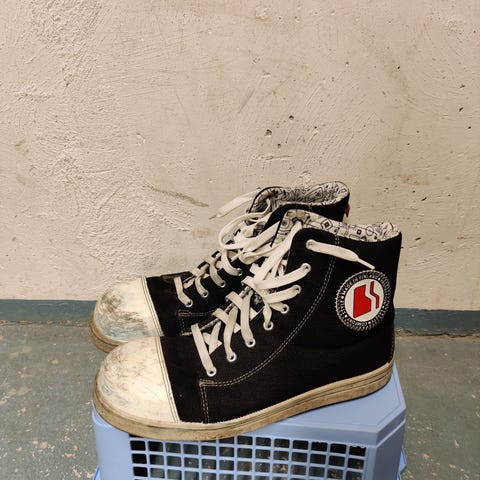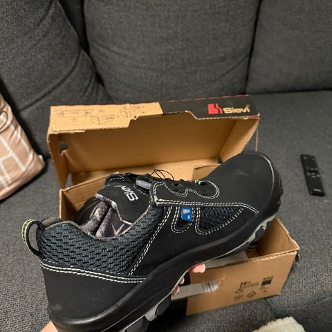 Sievi kengät, koko 43. Väri musta harmailla ja punaisilla yksityiskohdilla. Nauhattomat kengät pikalukituksella. Päällisessä on ilmanvaihtoaukkoja ja sisäosa on pehmustettu. Pohjassa karkea kuviointi, joka antaa pitoa. Sopivat arki- ja työkäyttöön tilanteesta riippuen.