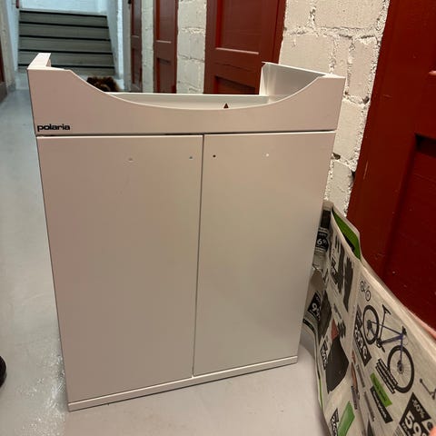 Polar allaskaappi ja pesuallas hanalla. Valkoinen allaskaappi kahdella ovella ja metallisilla vetimillä. Yläosassa valkoinen pesuallas, jossa yksivipuhana ja käsisuihku. Altaassa on ylivuotoaukko ja pohjaventtiili. Kaapin sisällä tilaa putkille ja säilytykselle. Sopii kylpyhuoneeseen tai kodinhoitotilaan. Putkiliitännät ja viemäröinti näkyvät kuvissa.