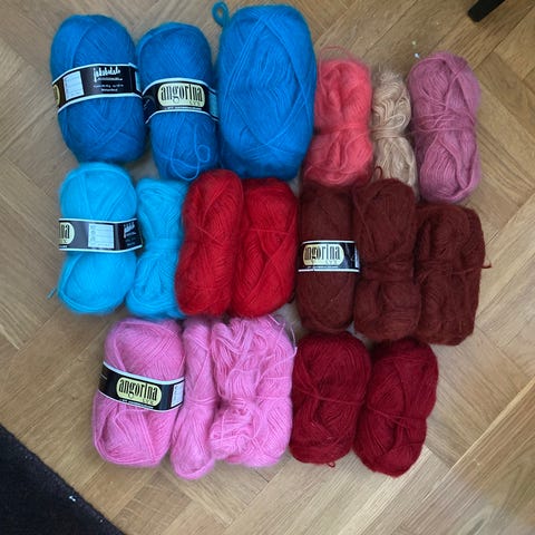 Novita Rose ja Angorina Lyx mohairsekoitelangat oranssina ja punaisena. Novita-kerässä koostumus 70 % akryyli ja 30 % villa, juoksevuus noin 390 m / 50 g. Angorina Lyx -langassa koostumus 35 % mohair, 45 % akryyli ja 20 % polyamidi, juoksevuus noin 127 m / 40 g. Langat soveltuvat neulontaan ja virkkaukseen esimerkiksi huiveihin, neulepaitoihin ja asusteisiin. Valmistettu Ruotsissa ja Suomessa etikettien merkintöjen mukaan.