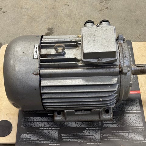 Sähkömoottori teollisuus- tai työkäyttöön. Runko uritettu jäähdytystä varten ja moottorissa suojakoteloitu liitäntäkotelo. Voidaan käyttää esimerkiksi erilaisissa koneissa tai laitteissa, joissa tarvitaan pyörivää käyttövoimaa. Tarkemmat tekniset tiedot, kuten teho, jännite ja kierrosluku, eivät käy ilmi kuvasta ja ne on hyvä tarkistaa moottorin tyyppikilvestä paikan päällä.