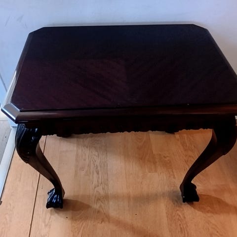 Korkeakiiltovalkoinen sivupöytä. Yksi pieni naarmu (kuva).