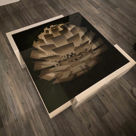 Sohvapöytä kirkkaalla ylälasilla ja vaalealla alalasilla.