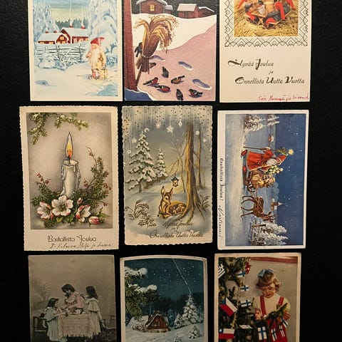 Joukossa on myös signeerattuja kortteja. Taiteilijoina mm. Eero-Einari Nurmela, E. Jaatinen, O. Sundelin, G. Forsström, J. Nyström. Kaikki kortit ovat 9-kokoa.