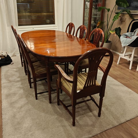Mahonkiviilutettu empiremallinen ompelupöytä (80x48), johon on lisätty pöytätason alaa vedettävällä työtasolla. Muotoilussa on empiren eli biedermeierin piirteitä, mutta toteutus on 1800- ja 1900-lukujen vaihteesta. Pöytä on hyväkuntoinen, vain pöytätasossa pieni lakkavaurio. Pöydän antiikin asiantuntijoiden antama vakuusarvo on 500 euroa.