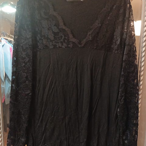 Musta trikoopusero pitsikoristein. KokoXL