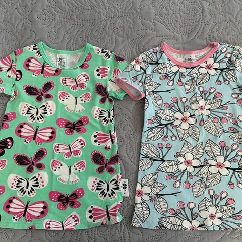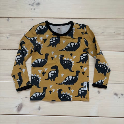 Uusi, siististi ommeltu pusero Paapiin luomutrikoota. Kankaat on esipesty ennen ompelua.